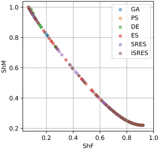 Alternatively, consider the solution obtained by SMS-EMOA (Equation (20)), corresponding to and . This solution yields a 77.60% reduction in ShM, while ShF is reduced by 9.54%.