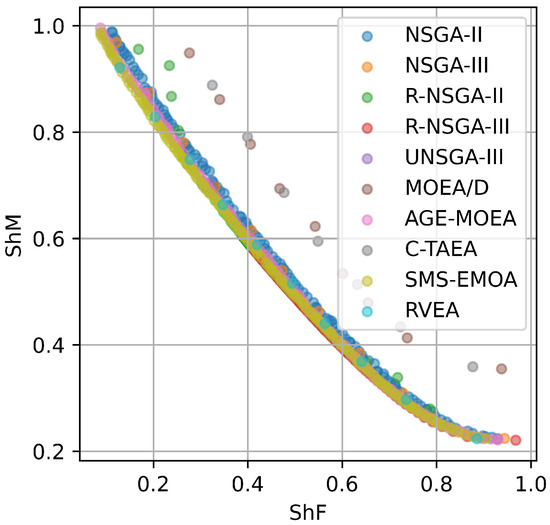 The multi-objective optimization algorithms were executed once, generating solutions that constitute the Pareto front. Conversely, each single-objective optimization algorithm was executed 200 times, each run employing a randomly selected value of (ranging from 0 to 1) to define the objective function, as described in Equation (16).
