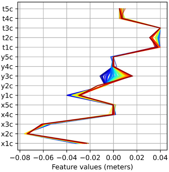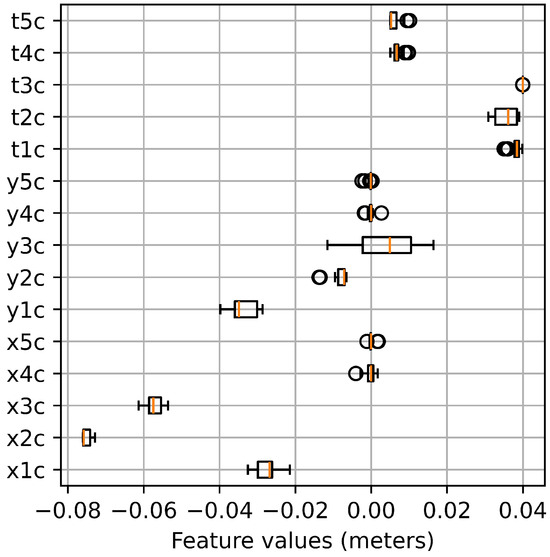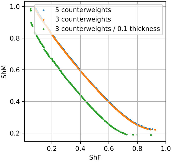 Figure 6 displays boxplots of the feature values corresponding to the best solutions identified by SMS-EMOA. It is observed that the x and y values for counterweights 4 and 5 are near zero. Furthermore, the thicknesses of these counterweights are very small, approaching the minimum bound (see Equation (15)); the average thicknesses are 0.0068 and 0.0059 for counterweights 4 and 5, respectively. This suggests that these counterweights contribute minimally to the optimization of the and objective functions. Some features exhibit more significant variance than others; for instance, assumes both negative and positive values.