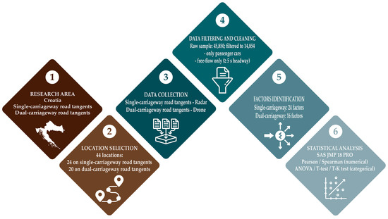 This research focuses on analyzing the operating speeds on tangent sections of both single- and dual-carriageway roads in Croatia, with the primary objective of examining the impact of various contributing factors on operating vehicle speeds. Road tangents were specifically chosen due to their distinctive influence on driver behavior and speed selection. Unlike horizontal curves, which impose physical constraints, such as centrifugal force, tangents are free from such limitations, enabling drivers to select speeds based on road geometry, visibility, and environmental conditions [15,22,33,34,35,36,37]. The lack of geometric constraints on tangents often results in higher operating speeds, making them crucial for understanding the variations in driving speeds and their implications for traffic dynamics. By concentrating on tangent sections, this study aims to enhance the understanding of how factors such as road design, surrounding environment, and traffic conditions interact to influence operating speeds. Through comprehensive data collection and subsequent statistical analysis, the research seeks to provide empirical insights into the factors shaping operating speeds, thereby contributing to a more nuanced understanding of speed behavior on road tangents.