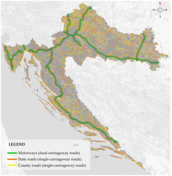 On the other hand, a “state road” is a public road that connects the entire territory of the Republic of Croatia and links it to the network of major European roads. A “county road” is a public road that connects the area of one or more counties [40]. The total length of state roads in Croatia is approximately 7307 km, and the total length of county roads is 9371 km [42]. State roads and county roads in Croatia differ primarily in their functional importance, design standards, and maintenance levels. State roads are classified as part of the national road network, and serve a critical role in connecting major cities, regions, and international borders. As such, they are generally subject to higher maintenance standards, featuring better quality pavement surfaces, higher retroreflective horizontal and vertical signage, and enhanced road safety equipment, such as guardrails. These roads are designed to accommodate higher traffic volumes and more diverse vehicle types, including heavy goods vehicles, and are typically prioritized in infrastructure planning and investment. By contrast, county roads primarily serve to connect smaller towns, municipalities, and local administrative areas. They are often characterized by lower design standards and are less frequently maintained, which may result in poorer pavement quality and reduced visibility or completeness of traffic signage and safety features.
