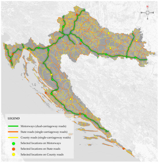In total, 44 measurement locations (22 cross-sections) were selected and distributed across the Croatian road network, as shown in Figure 4 and detailed in Appendix A.