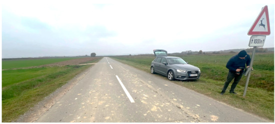 Speed data for single-carriageway road tangents were collected through field surveys which covered 12 cross-sections, corresponding to 24 measurement locations. Speed data were gathered using a radar device mounted discreetly on vertical road signs to ensure minimal visibility to drivers (Figure 5). Speeds were collected on days with moderate temperatures, low cloud cover, and no precipitation, wind, or fog, ensuring good visibility. Prior to conducting field research, data on the current road conditions were collected to avoid issues such as temporary road closures or traffic diversions caused by roadworks, accidents, or other incidents.
