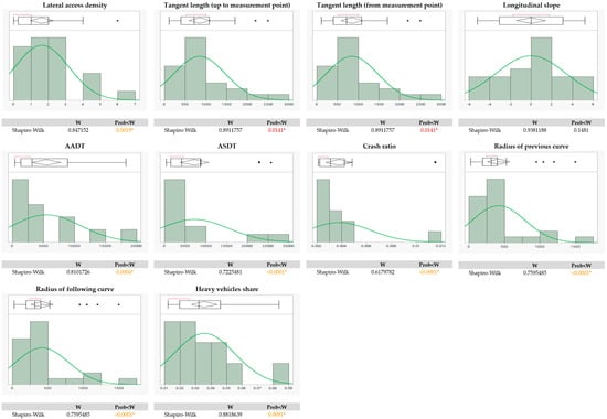 In this research, an analysis of 24 factors on single-carriageway road tangents and 16 factors on dual-carriageway road tangents was conducted to assess their potential influence on the vehicles’ operating speeds. These factors were selected based on their relevance to traffic flow and roadway design, as well as their potential to impact driver behavior and, consequently, the operating vehicles’ speeds. The factors analyzed included both roadway characteristics and traffic flow factors. Roadway characteristics encompassed parameters, such as lane width, speed limit, and longitudinal slope, among other parameters, all of which are critical in defining the physical constraints and perceived driving comfort on road tangents. Additionally, traffic flow factors, such as annual average daily traffic (AADT), average summer daily traffic (ASDT), and heavy goods vehicles share, among other factors, were examined to understand if and how the variations in traffic volume and vehicle distribution influence the operating speed. These factors were assessed for their individual impact on the operating speed on single- and dual-carriageway road tangents. Detailed factor identification forms the foundation for the subsequent statistical analysis, aimed at elucidating the relationships between these factors and the observed operating speeds. Accordingly, the factors that were analyzed for single- and dual-carriageway road tangents are shown in Appendix B.