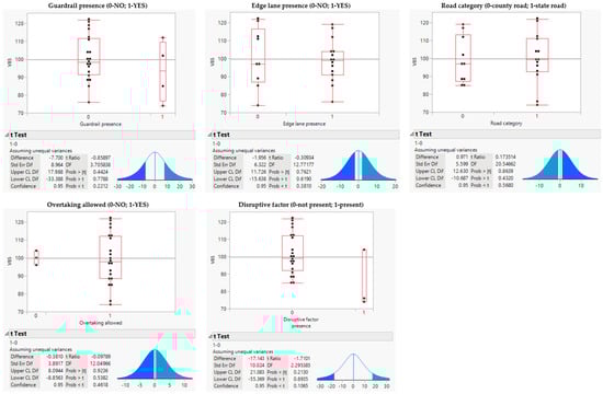 Defined by Croatian regulations [50], the design speed (Vp) represents the maximum safe speed under optimal weather conditions. This factor reflects roadway design intent and provides a benchmark for expected operating speeds. Terrain classification—flat, hilly, or mountainous—was included as a key factor due to its influence on vehicle speeds. The study by Martinelli et al. [51] indicated that operating speeds tend to be higher in flat areas and lower in hilly and mountainous regions due to challenging road geometry. The presence of guardrails enhances roadside safety and can encourage higher speeds by providing a perceived safety buffer. Conversely, roads without guardrails may prompt cautious driving. Similarly, shoulder lanes provide additional maneuvering space, which could potentially influence speed selection. Also, two road categories were analyzed, namely state roads and county roads. State roads generally exhibit superior design characteristics and maintenance, accommodating higher traffic volumes compared to county roads. The share of heavy goods vehicles and buses could also be an important factor. Large vehicles generally reduce speeds due to their lower acceleration capabilities and extended braking distances. Data on vehicle composition were sourced from Croatian Roads Ltd. [43]. Finally, the disruptive presence factor captures the influence of roadside infrastructure elements that may affect driver behavior and operating speed. This includes features such as bus stops, lay-bys, rest areas, pedestrian crossings, and similar elements located within or in close proximity to the observed road segment. The presence of these features can introduce potential conflict points, requiring drivers to reduce speed preemptively due to the increased likelihood of vehicle deceleration, pedestrian activity, or unexpected maneuvers [52,53]. As such, these factors represent localized disturbances to the otherwise uniform driving environment of tangent sections, and their inclusion in the analysis helps to account for reductions in speed that are not attributable to road geometry or traffic volume alone, but rather to contextual roadside conditions that influence risk perception and driving decisions.