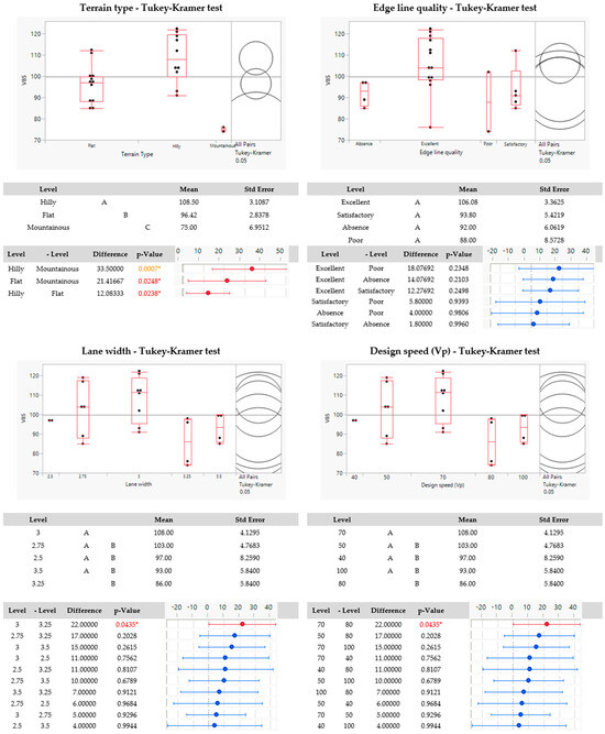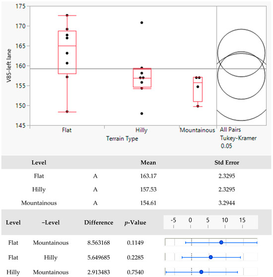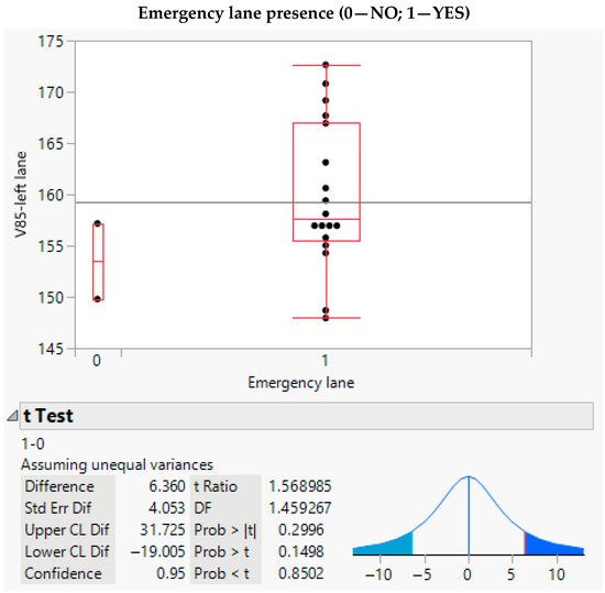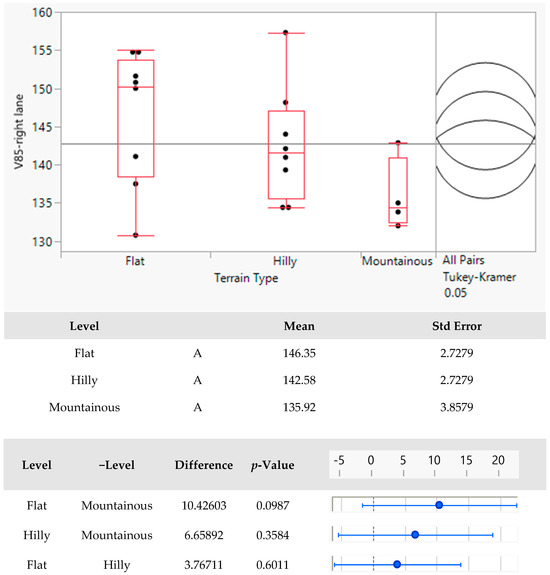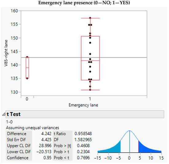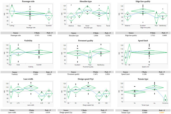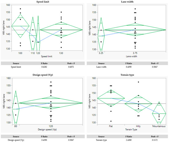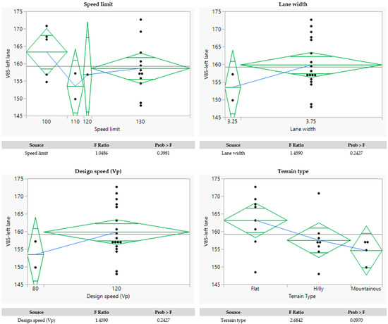 The data collected for this study were subjected to a comprehensive statistical analysis using SAS JMP 18 Pro software. The primary objective of the analysis was to examine the relationships between the operating vehicle speeds (V85) and the various geometric, environmental, and traffic-related factors along the road tangents. This analysis aimed to identify the significant associations that could provide insights into speed behavior on both single- and dual-carriageway road tangents.