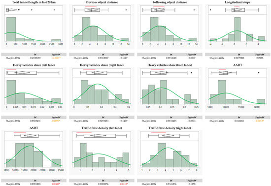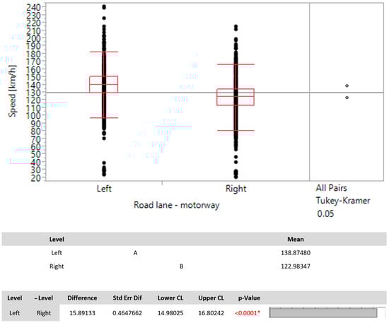 The data collected during each vehicle’s passage over the entry and exit detection lines were exported from Adobe Premiere Pro 2023 into CSV format files upon completing the video frame processing and annotation procedure. The data contained within the CSV files, generated from the processed aerial footage of specific motorway segments, were subsequently merged into a unified output attribute table. This table, created based on the described data processing procedure, was stored in a separate XLSX format file, suitable for performing the subsequent steps of statistical analysis. Subsequently, the speeds of individual vehicles in the traffic flow were determined based on the lengths of the observed motorway segments and the calculated travel times through each segment [45].