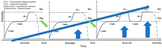 This study comprised three laboratory testing sessions (pre-, post-, and final), along with ongoing field-based and wellness monitoring. Daily subjective wellness questionnaires tracked sleep quality, fatigue, muscle soreness, mood, and perceived exertion. Athletes were instructed to maintain regular hydration habits, and all laboratory testing sessions were conducted in a euhydrated state,. Recovery was standardized by requiring 48 h without intense physical activity before each testing session. During the four-week intervention, the HIIT group performed twice weekly 30 min motor intermissions consisting of three specific long intervals during which the athletes ran at an intensity between their anaerobic threshold and the psychomotor fatigue threshold determined in the first laboratory session (Figure 1). The anaerobic threshold (ANT) was identified using fingertip blood lactate sampling and is defined as the exercise intensity corresponding to the individual anaerobic threshold, determined using lactate curve analysis following the protocol by Konefał et al. (2022) [9]. The psychomotor fatigue threshold (PFT) was determined using choice reaction time (CRT) assessments performed in the last minute of each 3 min treadmill stage. CRT deterioration, as described by Chmura et al. (2010) [15], was operationally defined as the first intensity at which a statistically significant increase in response latency or the error rate was observed compared to previous stages. The control group followed standard preseason training with a similar session frequency but without high-intensity interval exposure.