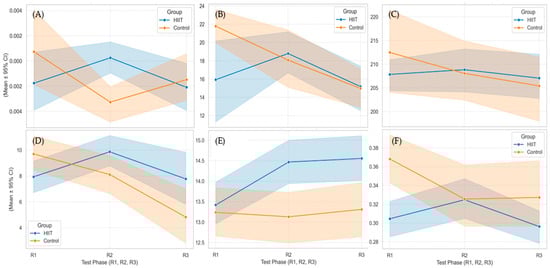 Longitudinal changes in key interaction-significant metrics. Line plots show mean values ± 95% confidence intervals across R1–R3 phases for both HIIT and control groups. Each subplot (A–F) represents a metric with a statistically significant group × time interaction. (A) Acute Cognitive Load Index, (B) Exercise-Induced BDNF (14 km·h−1), (C) Anaerobic Fatigue Index, (D) Lactate Accumulation Index, (E) OBLA Speed (km·h−1), and (F) Reaction Time at Final Stage.