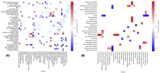 Cross-Domain Correlation Shifts in the Control & HIIT Group from R1 to R3. Heatmap showing changes in Pearson correlation coefficients (Δr) between variables from different physiological domains (e.g., metabolic, neuromuscular, cognitive, physical) within the (A) Control and (B) HIIT group from pre- to post-intervention (R1 to R3). Only statistically significant changes (p < 0.05) are shown, as determined by Fisher r-to-z transformation. Cell borders are drawn around pairs where |Δr| > 0.5, indicating large shifts in connectivity. Color gradients represent the magnitude and direction of change (blue = decreased correlation, red = increased correlation).