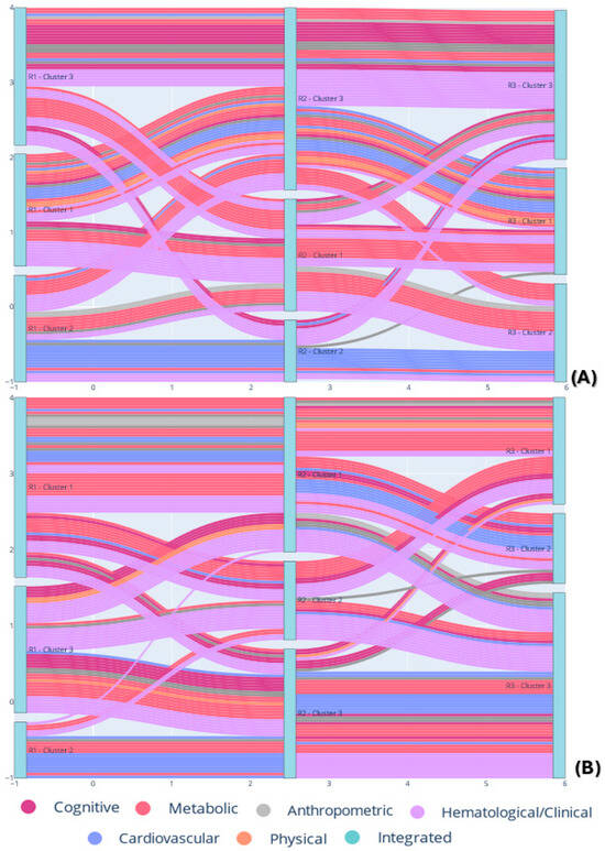 Sankey diagram illustrating cluster transitions across phases (R1 → R2 → R3) in the (A) Control and (B) HIIT group. Each node represents a domain-cluster combination within a specific phase, and the width of each flow (link) denotes the number of variables transitioning between clusters. Variables are color-coded by their physiological domain (Cognitive, Metabolic, Physical).
