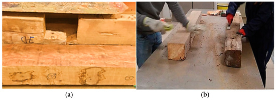 A set of pine wood beams was collected from various buildings that were demolished in central Lisbon between the mid-18th and mid-20th centuries for laboratory testing (Figure 1a). Five beams were selected from this set of wooden structural elements based on the criterion that more than 90% of their cross-section was defect-free. The selected beams exhibited a limited number of defects, including cut defects, metal nails, resin, and some knots (Figure 1b). All the selected beams were identified as Scots pine (Pinus sylvestris L.) and had been in use for over 200 years.