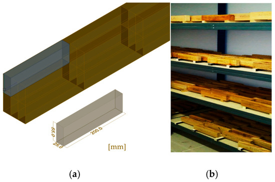 Samples measuring 25 × 55 × 200 mm were obtained by cutting the beams. The process of beam cutting and specimen geometry are shown in Figure 2a. These specimens were then submitted to moisture content (u) stabilization under a relative humidity (RH) of 65 ± 5% and a temperature of 20 ± 2 °C (Figure 2b) according to EN 384 [11]. These environmental conditions lead to a wood moisture content of around 12%, which was considered the reference.