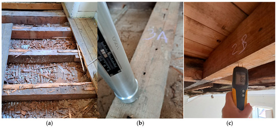 Figure 4. (a) Visual inspection of timber members; (b) needle penetration test; and (c) moisture content determination. - Visual inspection of the geometric dimensions and conservation state of structural elements (Figure 4);