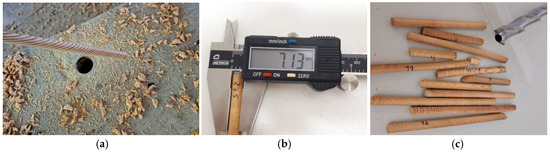 Figure 5. (a) In situ core extraction; (b) determination of the real (measured) wood density from wood cores; and (c) structure of wood cores.