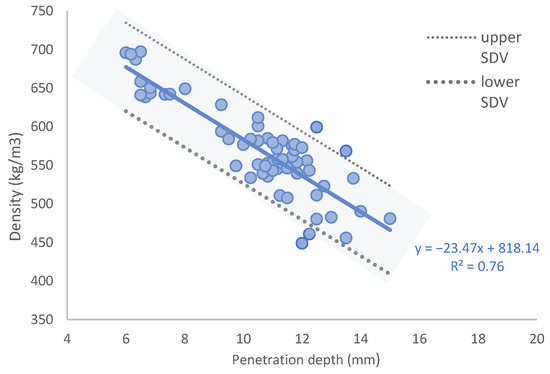 Previously, several authors reported varying correlations between wood density and NPR tests using Pilodyn 6J. The range of results is not surprising given the variability of wood density between different wood species as well as the variability of density in the same wood species. Various timber species were tested and correlation coefficients between the Pilodyn results and density ranged from 0.74 to 0.92, depending on the number of measurements and the species [38,39]. The authors of [34] investigated the correlation between penetration resistance using Pilodyn and the density of structural wood elements of the Scots pine (Pinus sylvestris L.) species obtained from an 18th century building, achieving a coefficient of determination of 0.59. The authors of [40] found good correlation coefficients (−0.73 and −0.68) between the wood density and pin penetration depth for Pinus pinaster standing trees. Also, the author of [41] obtained a stronger correlation (R2 = 0.91) between the Pilodyn penetration depth and density of chestnut (Castanea sativa Mill.) wood. The authors of [39] tested in situ two king-post timber structures with a moisture content different from that of the laboratory conditions and found a moderate coefficient of determination (R2) of 0.50, and the authors of [6] tested Pinus sylvestris and Pinus pinaster samples with 195 readings, finding a coefficient of determination (R2) value of 0.80.