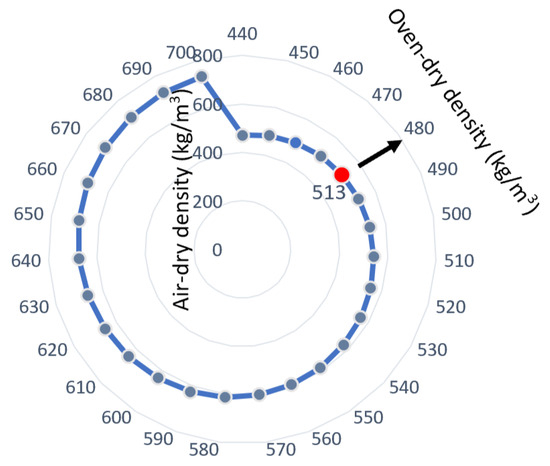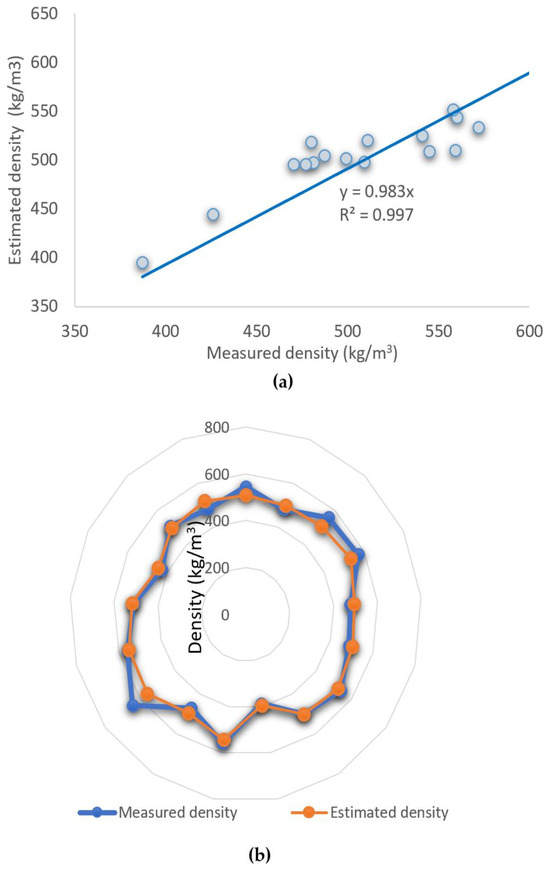 Since the wood density was measured on defect-free and small wood samples (20 × 20 × 30 mm) and reported as oven-dry values, the estimated density results were validated by comparing them with the previously reported oven-dry density values using the following equation (Equation (2)) for transformation [37]: