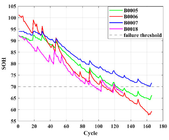 This paper uses the well-known NASA lithium-ion battery dataset as the research object, in which the battery model is the 18,650 lithium iron phosphate battery. The following experimental operations are performed on B0005, B0006, B0007, and B0018 batteries at a battery experimental temperature of 24 °C and a rated capacity of 2 Ah. The first step is to charge the four batteries with constant current and constant voltage. Under the current environmental conditions, they are first charged with a constant current of 1.5 A. When the battery voltage reaches 4.2 V, they are charged with constant voltage and current. When the current reaches 20 mA, the first step ends; that is, the charging stage ends. The second step is to discharge the battery with a constant current of 2 A and discharge B0005, B0006, B0007, and B0018 to cut-off voltages of 2.7 V, 2.5 V, 2.2 V, and 2.5 V, respectively [30]. At this point, a charge and discharge experiment is completed. Then, in order to accelerate battery aging, the above operation is repeated. When the actual capacity of each battery is less than 1.4 Ah, the end-of-life condition is reached. The capacity degradation curves generated by the four batteries are shown in Figure 1. The corresponding parameters are shown in Table 1.