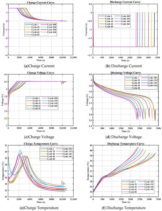 In practice, lithium-ion batteries are more stable when charging than when discharging. To this end, the current–time curve, voltage–time curve, and temperature–time curve of the B0005 battery under different cycles of charging and discharging are compared, as shown in Figure 2a–f. To clearly illustrate the state of charge and discharge of each battery over time, the curves in the figure are presented in a gradual gradient from light to dark. The charging process of lithium-ion batteries is generally divided into a constant current charging stage (CC) and a constant voltage charging stage (CV). The battery is charged with constant current to the voltage charging limit, then it enters constant voltage charging to maintain a constant charging current. The charging time of the battery is essentially determined by the available capacity. When the battery health state (SOH) decreases, the reduction in its actual available capacity will directly shorten the duration of the constant current charging stage. It is worth noting that in the case of capacity decay, in order to achieve a fully charged state, the subsequent constant voltage charging stage may require additional extended operation time. As shown in Figure 2a–f, the constant current charging time of the battery and the time when the cut-off voltage and temperature reach the peak value show a trend of gradually shortening when charging under different cycle periods, and the time when the charging temperature reaches the peak value is gradually advanced, showing a certain regularity and stability. At the same time, the current–time, voltage–time, and temperature–time curves during discharge are affected by various factors and have poor stability [32]. Taking all factors into consideration, we selected five health factors, namely equal pressure rise charging time, constant current charging time, constant voltage charging time, corresponding time of temperature peak during charging, and constant current charging time ratio, as the characteristics of this SOH characterization. In addition, the above five health factors are marked as HF1, HF2, HF3, HF4, and HF5 in order to facilitate subsequent research and description.
