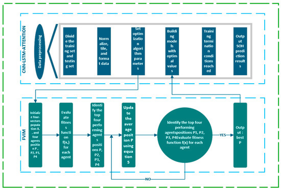 Then, the initial parameters of the CNN-LSTM-Attention model are set, including the number of hidden layer nodes, regularization coefficients, and the selection of activation functions. This allows the neural network to have sufficient learning ability, and after finding the optimal initial parameters in the optimization algorithm, the model is constructed with the optimal weights and parameters, and then the SOH is predicted and estimated. The flowchart of the overall model is shown in Figure 5.