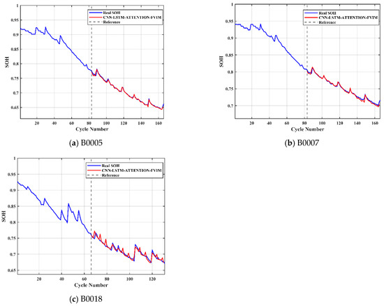 The RMSE and MAE Index data of different datasets and different prediction models are shown in Table 5. It can be seen from Table 5 that the prediction accuracy of the single CNN model and the CNN-LSTM-Attention model is poor, and the error is large. The maximum MAE and RMSE of the two models reached 3.78% and 3.98%, respectively. At the same time, the GRU model and the BILSTM model are still not ideal for the prediction of battery SOH. With the increase in battery aging times, the linearity of the aging curve becomes weaker, and the deviation between the prediction result and the actual value increases in the later period. The RMSE and MAE of the CNN-LSTM-Attention-FVIM model we developed are 1.33% and 0.99% at the maximum. Among them, the evaluation index MAE of the B0018 battery is 64%, 68.27%, 67.96%, and 68.47% lower than that of the GRU model, BILSTM model, CNN model, and CNN-LSTM-Attention model, respectively. It can be seen that the CNN-LSTM-Attention-FVIM model performs well in most cases and has better stability. This also shows that the model proposed in this paper is more feasible for the prediction and estimation of lithium-ion battery SOH.