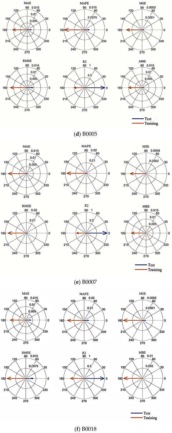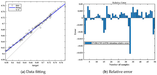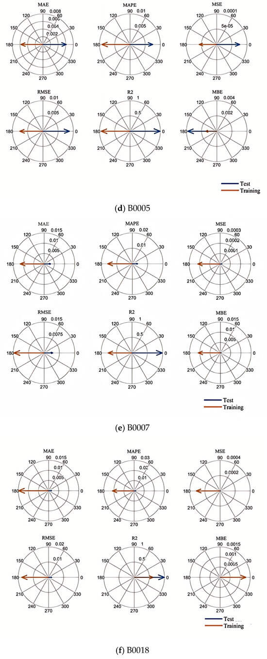 After completing the above preparations, the processed dataset is input into the CNN-LSTM-Attention-FVIM prediction model. In this part, we use the battery aging data of B0005, B0007, and B0018 for prediction, and we train 60% and 50% of the battery data before predicting the battery life to achieve multi-faceted evaluation of the model. First, Figure 6a–c represent the prediction graphs of 50% of the training data of the three batteries, B0005, B0007, and B0018, Figure 7a–c represent the prediction graphs of 60% of the training data of the three batteries, Figure 6d–f represent the error graphs of 50% of the training data of the three batteries, and Figure 7d–f represent the error graphs of 60% of the training data of the three batteries. First, it can be seen from the prediction graphs for 50% and 60% of the training data that the model has good prediction ability and can accurately fit the capacity decay trajectory of the B0005, B0007, and B0018 batteries. Regardless of the number of training samples, the prediction curve is still highly consistent with the true value. The CNN-LSTM-Attention-FVIM regression prediction model can effectively capture the battery aging characteristics and stabilize the prediction accuracy within a certain range through adaptive functions and dynamic adjustment of key parameters. In addition, to show the size of the prediction error of this model more intuitively, compass charts are used to characterize other performance indicators such as MAE and RMSE. As shown in Figure 6d–f and Figure 7d–f, the test set axes of the two graphs of RMSE and MAE are close to the center, forming a small circle. In addition, the axis lengths of MAE and RMSE of a single battery are close, indicating that the error distribution is uniform and there is no large outlier error. At the same time, it can be clearly seen from the data shown in the figure that MAE and RMSE are around 1%. The error is stable without obvious fluctuations. At the same time, in order to more intuitively show the model’s ability to fit the data, we selected the B0018 battery with relatively large error and showed its data fitting graph and relative error graph, as shown in Figure 8a,b. From the two figures, it can be clearly seen that most of the data are near the baseline, and the relative error distribution is concentrated, mostly distributed around 0.01 to −0.01, indicating that the model is robust. At the same time, from the data in Table 3, it can be intuitively seen that the MAE and RMSE of the proposed model are significantly better than other models. Among them, the range of MAE of this model is stable at about 0.7%, and the range of RMSE is stable at around 1%. Compared with other models, the CNN-LSTM-Attention-FVIM prediction model has good adaptability and robustness for the three groups of batteries, which also proves that the model proposed in this paper has good estimation ability in the face of SOH changes. From Table 4, it can be seen that when the proportion of the training set increases to 60%, the MAE and RMSE of the three groups of batteries are still small, and the prediction accuracy is still high, proving that the model has excellent degradation feature learning ability.