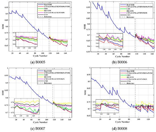 From Figure 9, the model SOH prediction estimation comparison chart shows that CNN-LSTM-Attention-FVIM has a strong prediction ability for experimental battery data, especially for the B0005 battery and B0007 battery. The prediction curve and the true curve are almost completely overlapping, demonstrating the superiority of the CNN-LSTM-Attention-FVIM model prediction. In contrast, the prediction accuracy of the GRU model, BILSTM model, CNN model, and CNN-LSTM-Attention model is poor. Their prediction curves are mostly above the true value, and the curve following is also poor, with large fluctuations resulting in large amplitudes and poor stability. However, CNN-LSTM-Attention-FVIM has multiple performances that are significantly better than other models. In addition, it also shows excellent fitting in the battery capacity regeneration stage, meaning it still has good predictability for battery SOH, showing good robustness and stability, providing a new solution for battery SOH prediction.