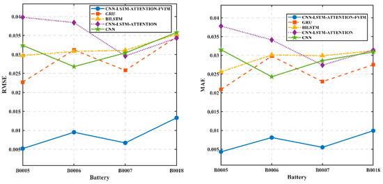 In order to verify the stability and excellence of this model and to better interpret the characteristics of this model, we used the processed NASA battery data to predict and estimate using other GRU models, BILSTM models, CNN models, and CNN-LSTM-Attention models. These results were then compared and verified with the CNN-LSTM-Attention-FVIM optimization prediction model proposed in this paper. For this comparison and verification, we used B0005, B0006, B0007, and B0018 batteries from NASA. Under the same conditions as the other parameters, we used 70% of the battery data as the training set for each model and the remaining 30% as the test set for estimation and comparison. The SOH prediction comparison chart of each model is shown in Figure 9a–d, and a comparison of the MAE and RMSE indicators for each model is shown in Figure 10.