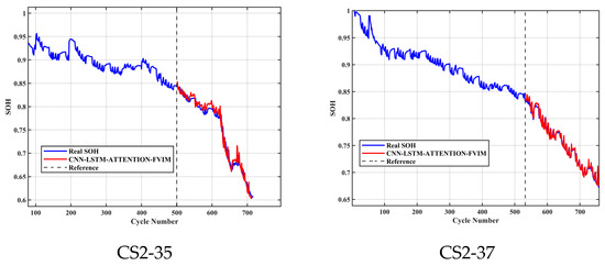 The above description uses four battery datasets provided by NASA to verify the CNN-LSTM-Attention-FVIM model in this paper, which reflects the strong predictive ability of the model proposed in this paper. In order to further verify the generalization ability and robustness of the model, we used the CS2-35 and CS2-37 battery datasets provided by the University of Maryland for prediction and verification. We did not modify any parameters, we used the same health features as the NASA dataset, and we provided 70% of the data as the training set for predicting and estimating. As shown in Figure 11, the CNN-LSTM-Attention-FVIM model proposed in this paper still has a high predictive ability, and the predicted value is very consistent with the true value. This shows that the model proposed in this paper has a strong generalization ability, and it can have a strong predictive estimation ability in the face of datasets from different sources, showing adaptability to the downward trend of different datasets.