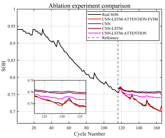 In order to further verify the feasibility of the model proposed in this paper and the impact of a single model in the CNN-LSTM-Attention-FVIM model on the prediction effect, we conducted an ablation experiment and discussed the computational cost and training time. The ablation experiment and the recorded running time were run on the same computer configuration and under the same parameters using MATLAB R2024a. The ablation experiment involved gradually removing or replacing specific parts of the model and observing the performance changes, thereby revealing the necessity and effectiveness of each module. Therefore, in this ablation experiment, we selected the B0007 battery dataset as the experimental object and set the training set ratio to 70%. It can be seen from Figure 12 and Table 7 that when the FVIM algorithm is not added, the prediction accuracy of the other three models is poor, especially the single LSTM model, which has the worst prediction accuracy. After adding FVIM optimization, the prediction accuracy is significantly improved, which further illustrates the applicability and high-precision prediction of the model proposed in this paper.