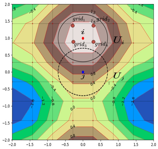Here, is the potential peak found. is all the grid points within the neighborhood of the individual i. When the fitness of a real individual i is greater than the maximum fitness of the grid points within its neighborhood, i is regarded as a potential peak. The formula for the neighborhood setting of is shown in Equation (10). In general, the four nearest grid points to i are considered, but, in special cases when i is in the grid, the neighborhood range is moderately expanded.