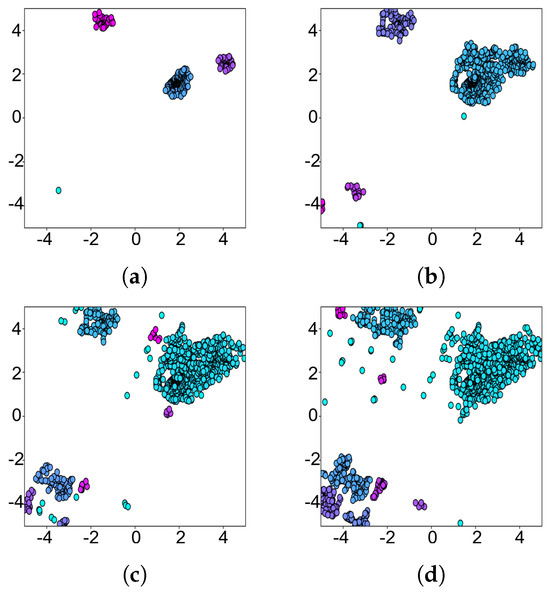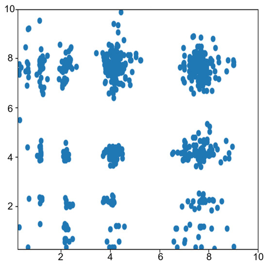 It is initially necessary to preprocess the potential peak set by selecting the top individuals in the neighborhood of . This reduces the algorithm’s computation time, as well as eliminating some of the possible noise. Then, these individuals are clustered by using DBSCAN to obtain multiple clusters. As shown in Figure 6, each cluster represents a niche. Assuming the existence of a peak in each niche, which is the best adapted individual i among the niches, the range of the niche is determined with i as the center of the circle. The radius of the niche is specified in Equation (12).