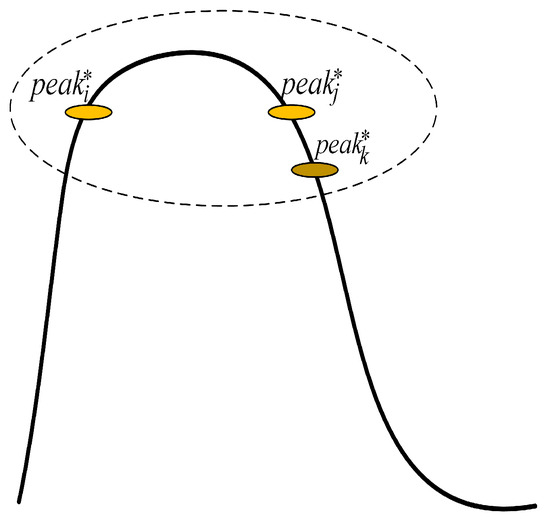 The potential peak set is obtained via TCDE, as described in the previous section. However, among these potential peaks, some potential peaks may belong to the same peak. As shown in Figure 5, , , and belong to the same peak. A detailed search in this region is thus needed to obtain the real peaks.