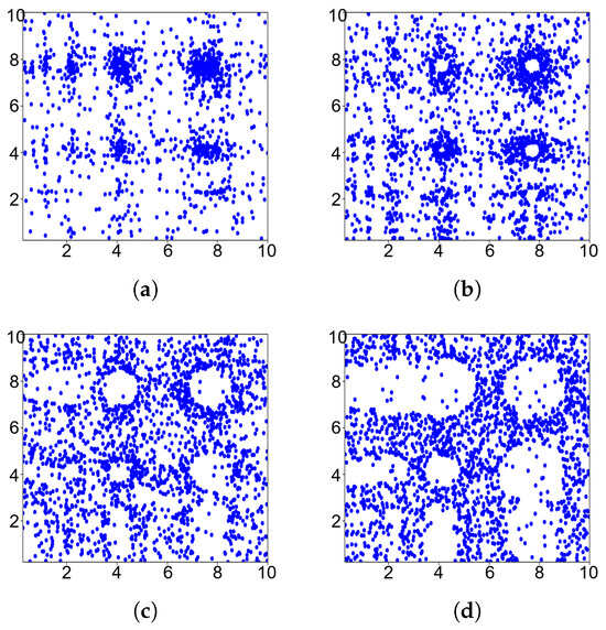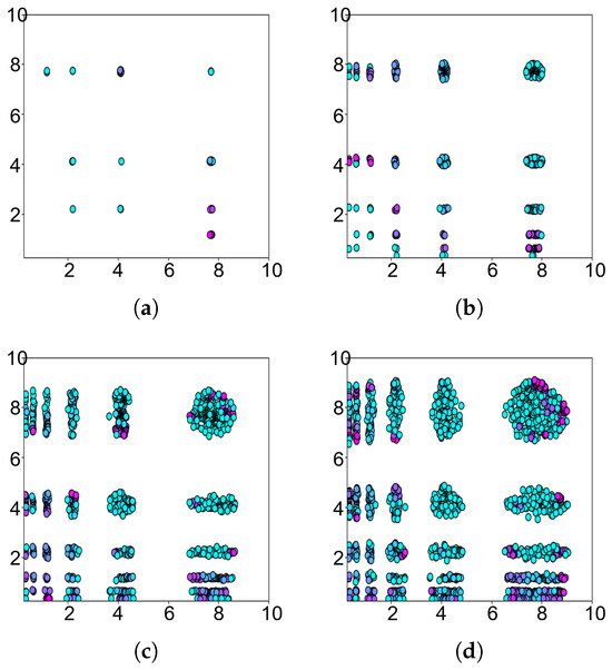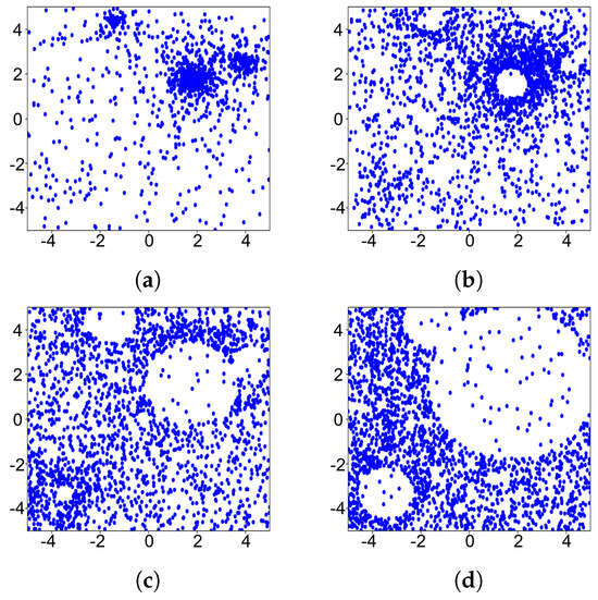The distribution of individuals in the TCDE algorithm’s topographical exploration after setting taboo areas is shown in Figure 11. It can be seen that, as the algorithm iterates, the taboo regions also constantly change. This causes the population to constantly move away from the positions where the peaks have been explored during the evolution of the algorithm. In this way, the TCDE algorithm can explore areas that were previously underexplored more carefully.
