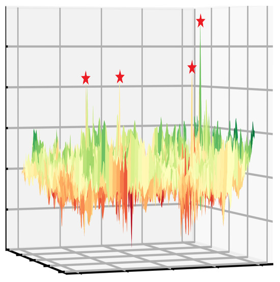 Figure 14 depicts the target PCB image with dimensions of 393 pixels × 422 pixels, while Figure 15 illustrates a template resistor image that is 34 pixels × 51 pixels in size. Within the target PCB image, there are four regions that resemble the pattern in the template resistor image, indicating the presence of four peaks. The matching process transforms into a multi-peak optimization function after the application of NCC, as depicted in Figure 16. From the graph, it can be observed that this is a standard multi-peak optimization problem, with four peaks in the search space, representing the four optimal matching positions. Additionally, there are many irregular local peaks in the search space, which are significant sources of interference. The objective is to avoid all local peaks while accurately identifying all global ones. However, due to the abundance of local peaks, the algorithm can easily become trapped, making it difficult to locate the global peaks, which are narrow and hard to detect. As a result, the problem poses significant challenges.
