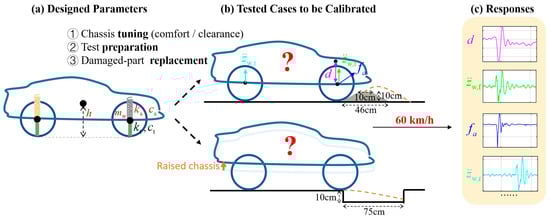 However, calibrating vehicle dynamics models is significantly more challenging in misuse tests than in durability tests [5]. As depicted in Figure 1, parameter differences between the tested and designed vehicles may arise from chassis tuning for comfort and clearance, test preparation, and damaged-part replacement. Road obstacles are significantly larger during misuse tests. At high driving speeds, the dynamic responses of displacements, acceleration, and forces are typically highly nonlinear with respect to certain vehicle parameters [6,7].