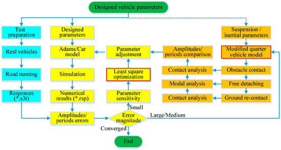 The overall calibration workflow for vehicle misuse tests is illustrated in Figure 2. Starting from the designed vehicle parameters, the full processes are mainly divided into three phases: (a) road tests of the real vehicle, (b) calibration loops using virtual simulation in Adams/Car, and (c) a theoretical auxiliary analysis using the modified quarter-vehicle model.