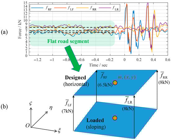 Calibration of the vehicle’s mass and centroid position through the wheel load responses on a flat road segment: (a) computation of the average wheel loads from the responses on the flat road segment and (b) theoretical support model of the rigid chassis.