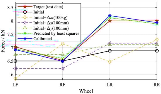 Calibration of the vehicle’s mass and centroid position using the least squares method: four-wheel load data for the target, the initial model, and the variant models; that predicted using the least squares method; and that for the simulated model (∆m = 100 kg, ∆x = ∆y = 100 mm); the value unit is kN.