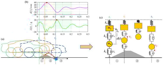 When the vehicle passes over relatively large obstacles at high speeds, the shock absorber’s compression and the wheel center’s acceleration exhibit strong nonlinearity. This is caused by discontinuous changes in the tire–ground contact conditions, which are subsequently reflected in the vehicle’s responses. The contact process is naturally divided into three stages on the timeline, as depicted in Figure 6a: ① , the obstacle contact stage; ② , the tire detachment stage; and ③ , the ground recontact stage. The contact status between the tire and the road varies distinctly in these three stages, presenting different dynamic characteristics that result in complex, nonlinear responses.
