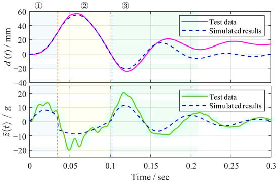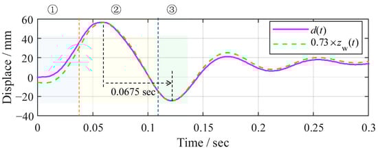 The half-period of the slower vibration component in stage ② can be read from the displacement response, as shown in Figure 7, as 0.0675 s, whereas the faster component can be read from the acceleration response in Figure 8 as 0.0058 s. By comparing the slower and faster components with the theoretical circular frequencies in Equation (17), the following algebraic equation is obtained: