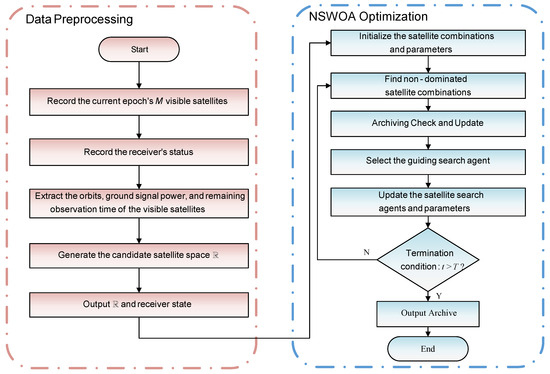 2.3. Procedure of the NSWOA-Based Satellite Selection Algorithm