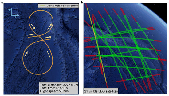 Unmanned aerial vehicle simulation scenario. (a) Flight trajectory: A UAV, cruising at approximately 50 m/s, flew over a coastal region in Asia for 65,550 s, covering 3277.5 km. The trajectory included a straight climb to 1500 m, followed by an “8”-shaped cruising maneuver, and a descent back to 1000 m. (b) The trajectories of satellites: The visible Starlink and Orbcomm satellites are shown by green and yellow solid lines, respectively, while the red line represents the trajectory of the satellite as it moves out of the observable range.