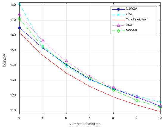 Comparison of DGDOP between NSWOA, NSGA-II, PSO, and GWO algorithms. The true Pareto front refers to the fully ideal front obtained by exhaustively evaluating the DGDOP values of all possible satellite combinations.