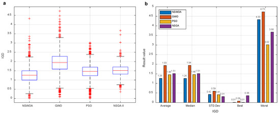 From the comparison in Figure 4, it can be observed that the box for the NSWOA is positioned lower, indicating smaller values, with better median and optimal values. The overall shape of the box is flatter, suggesting good convergence and diversity. The minimum IGD value for the NSWOA is 0.01, outperforming the GWO and NSGA-II algorithms and performing similarly to the PSO algorithm. In terms of average and median IGD values, the NSWOA surpasses the GWO, PSO, and NSGA-II algorithms by approximately 35%, 14%, and 17%, respectively. Moreover, it remains highly competitive in terms of standard deviation and worst-case values, demonstrating that the NSWOA possesses the best overall optimization capability.