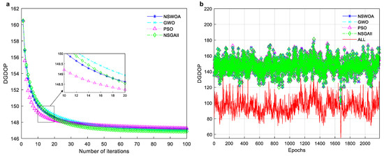 Figure 5 illustrates the iteration results and the DGDOP convergence of each satellite selection algorithm. It can be observed that the DGDOP values in the observation epochs converge rapidly when the proposed NSWOA is applied. The iteration statistics are shown in Table 6.