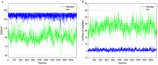 Comparison of DGDOP and the number of satellites selected by all selection and the NSWOA Optimization. (a) Comparison of DGDOP values between NSWOA star selection results and all selection results. (b) The comparison of the satellite count between the NSWOA-selected subset and the all-satellite selection results.