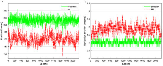 Comparison of positioning accuracy and computation time between all satellite selection and the NSWOA. (a) Comparison of positioning accuracy for 2185 epochs. (b) Comparison of computation time for 2185 epochs.