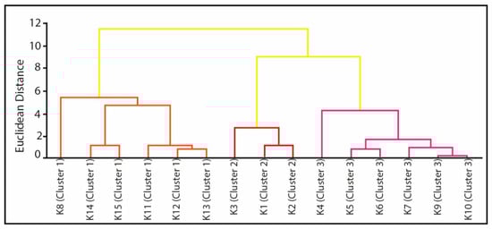 The results of the hierarchical cluster analysis (HCA) reveal three distinct clusters of sediment samples based on their metal concentration patterns. Cluster 1 (K8, K11–K15) contained moderate levels of Cr and Zn, lower Cu content, and relatively higher Th–U ratios. Cluster 2 (K1–K3) exhibited higher levels of V and Co, while other metals were relatively lower. Cluster 3 (K4–K7, K9–K10) showed the highest levels of Cu and Zn, along with moderate to high levels of Ni and Cr. This cluster likely represented regions with significant pollution and corresponded to most contaminated areas, especially in terms of Cu and Zn. Cluster 2 was closer to the natural background levels, despite elevated V and Co concentrations. Cluster 1 showed moderate levels of Cr and some radioactive elements (Th–U) (Table 3, Figure 4). Upper Continental Crust (UCC) [61] values were used as a reference for comparison (Table 3). The observed clustering could have been caused by a combination of anthropogenic and environmental variables. The highest concentrations of Cu, Zn, Ni, and Cr were found in Cluster 3, which was probably associated with regions more impacted by urban or industrial activities. These sites were located near residential areas, road networks, or untreated wastewater discharge points. Cluster 2 samples, on the other hand, which had higher V and Co levels, but generally lower metal levels, might have come from upstream regions that were comparatively little affected, perhaps representing natural geogenic sources with little anthropogenic interference. Cluster 1, with moderate Cr and elevated Th–U levels, might have been associated with regions influenced by lithological characteristics, such as the presence of naturally enriched source rocks or variations in grain size that enhanced the adsorption and accumulation of certain elements. Finer-grained sediments tend to retain higher concentrations of trace metals due to their larger surface area, which is often associated with a higher organic matter content.
