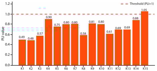 Among the analysed samples, K15 (PLI = 1.05) slightly exceeds the baseline value, indicating slight pollution. Samples K4 and K14 exhibit PLI values of 0.90 and 0.88, respectively, which are below the pollution threshold, indicating no pollution or low contamination. All remaining samples have PLI values < 1, reflecting generally low contamination levels in the study area (Figure 5).